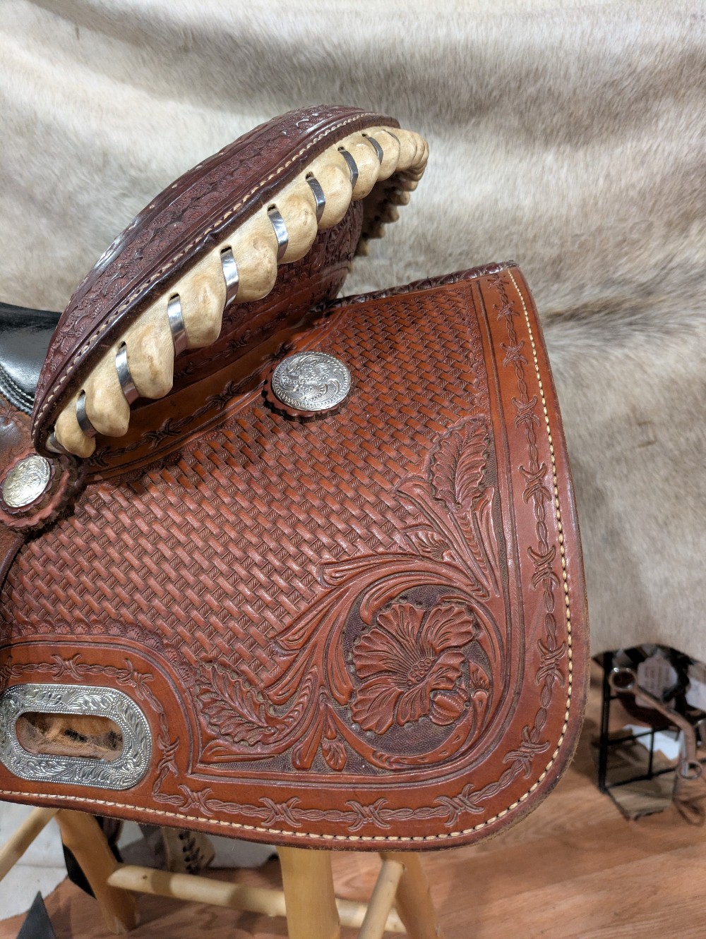 Combo tooling, rawhide braided cantle, Roughout seat and fenders for grip!