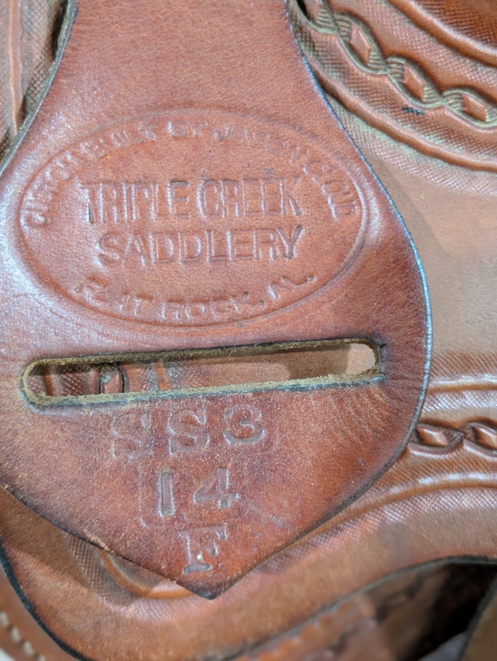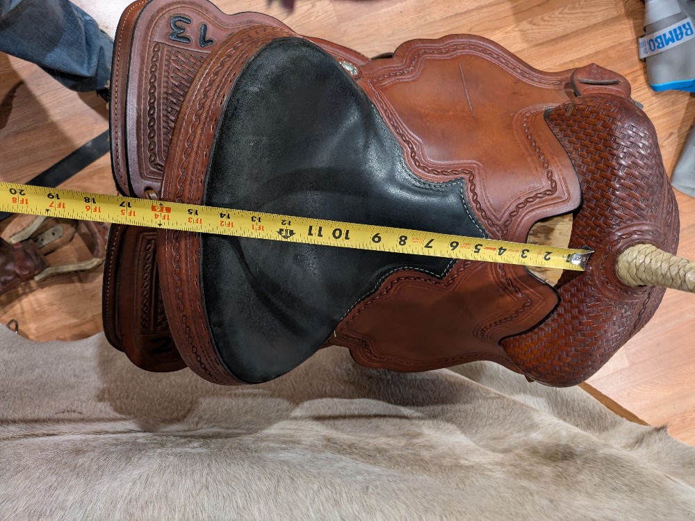 Cute used Triple Creek trophy barrel saddle. 14" fQHB estimated (not confirmed either company, plz see pictures. Fits wide with flare shape at front of shoulder room. Please see pictures for condition and comparison measurements and feel free to ask questions prior to purchase.