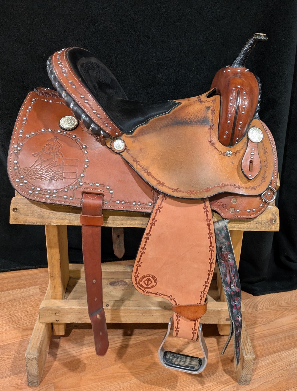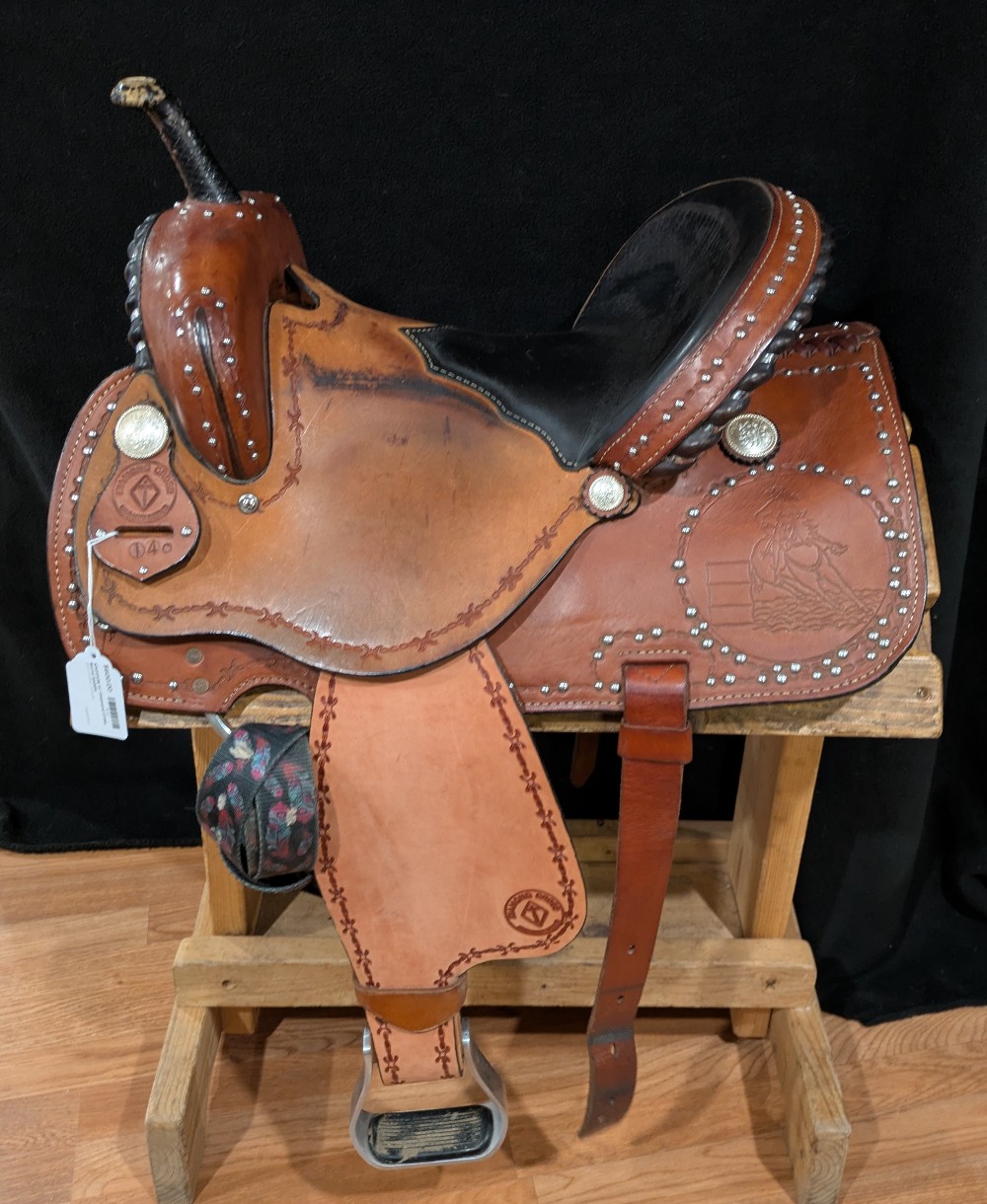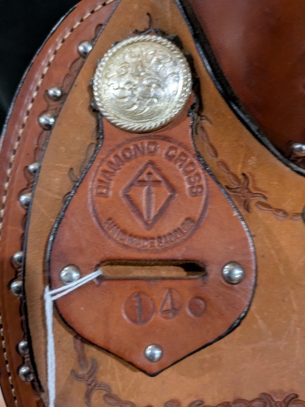 Cute Diamond cross Barrel saddle. 14" Reg/quarter horse bars estimated. Please see pictures for condition and comparison measurements and feel free to ask questions prior to purchase. New fenders were made to match. Features cute spots and barrel racer tooled skirts.