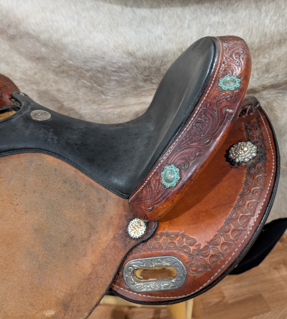 Cute as a bug 14" Kelly Kaminski Barrel saddle, Flex 2 WIDE tree, by Circle Y. Shirt skirt length l, supportive cantle, rough out seat jockey and fenders. BRAND NEW Stirrup Half leathers for safety. Ready to ride? Please see pictures for condition and comparison measurements and feel free to ask questions prior to purchase. Note: variety of conchos, and one missing at top of cantle (cosmetic only)