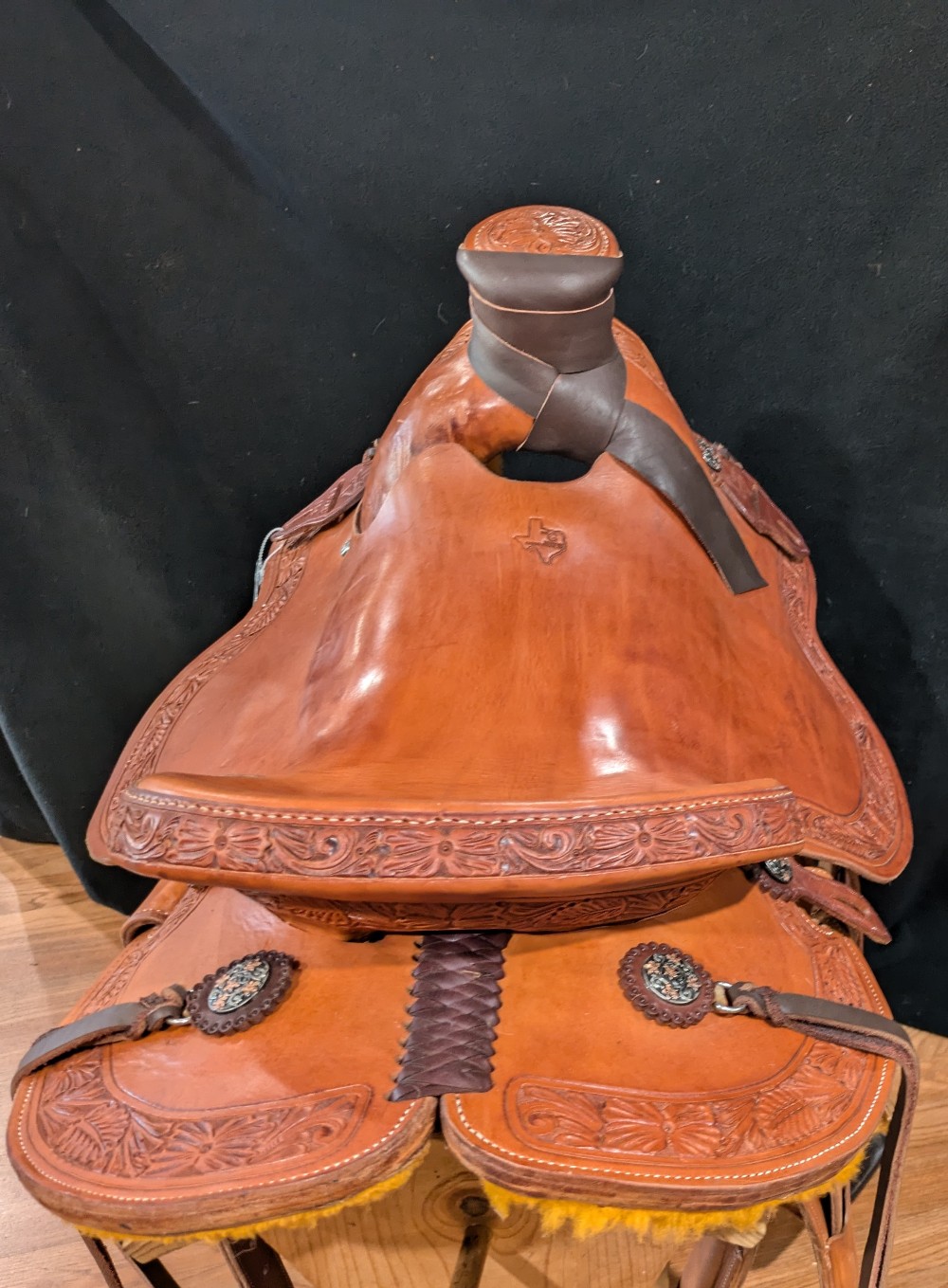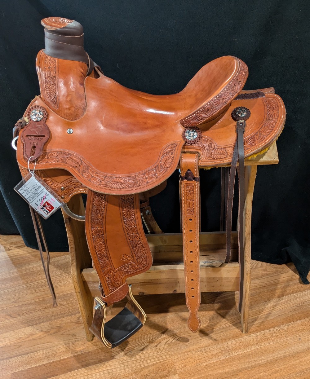 Features 100 wool lined skirts, wrapped horn, slick seat, floral border tooling, hamley twist fenders, wood stirrups, matching flank cinch set, and upgraded conchos with strings!