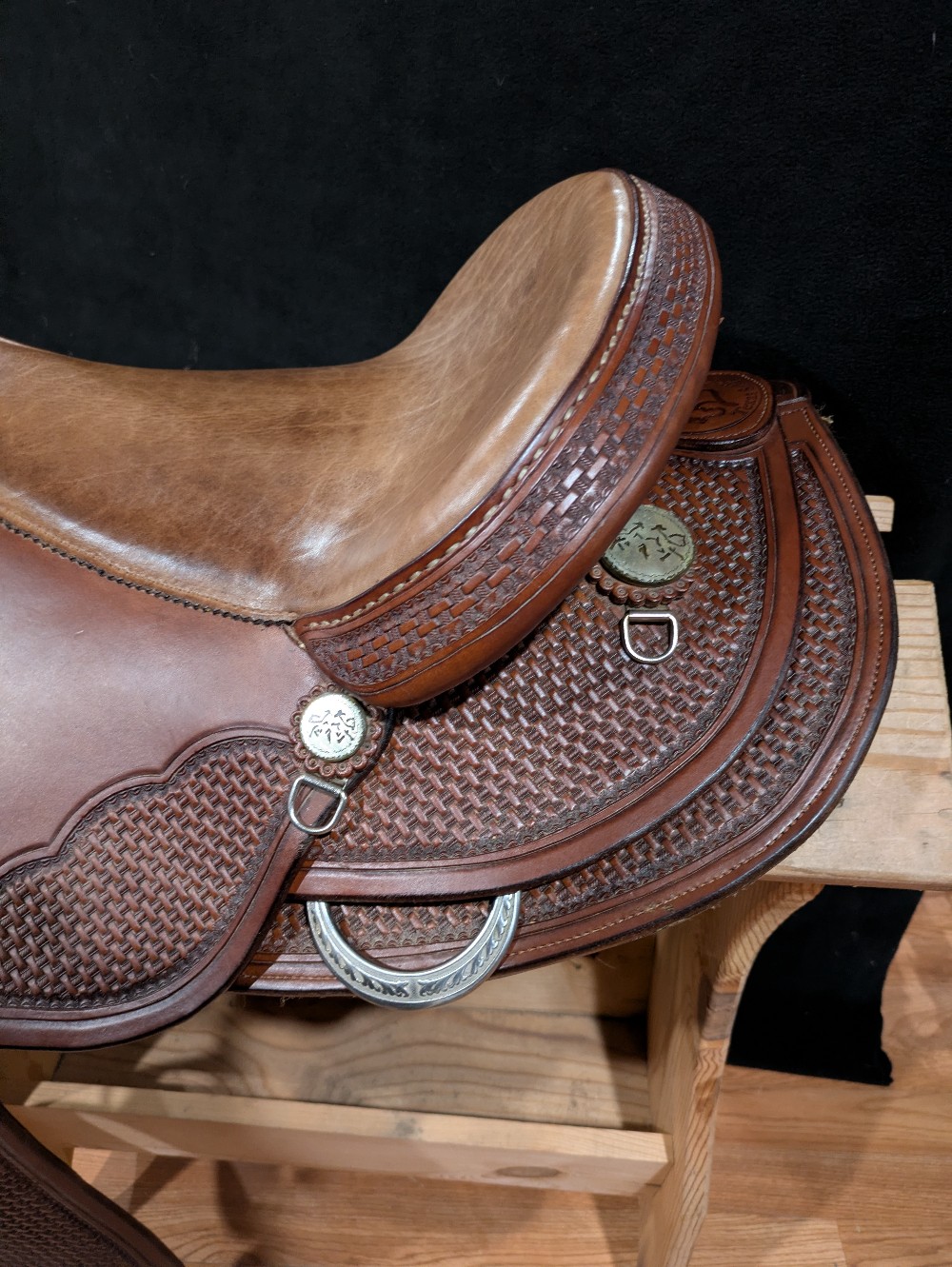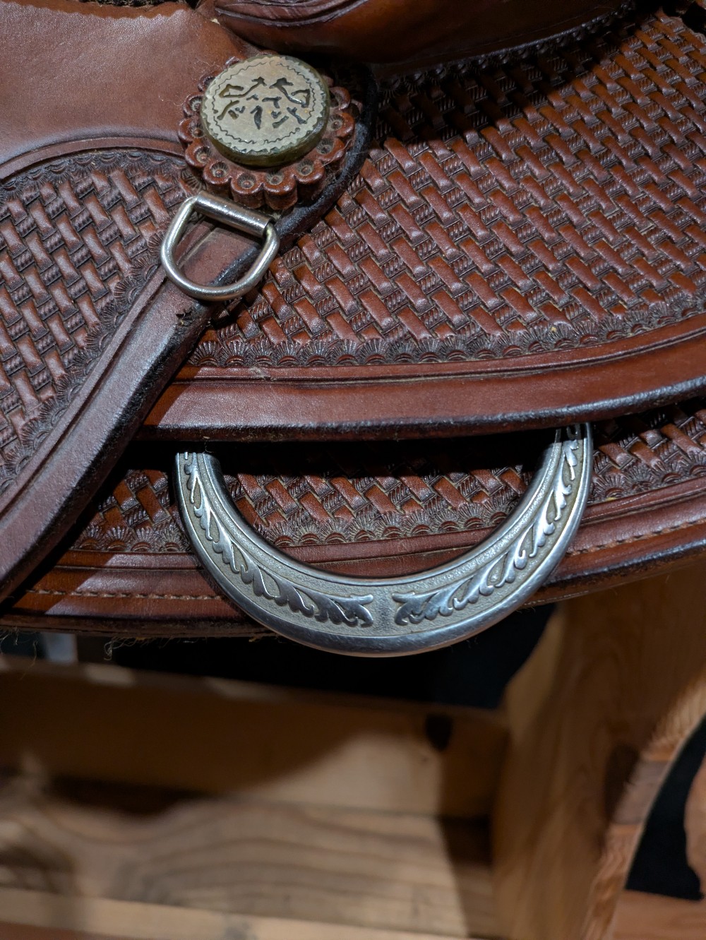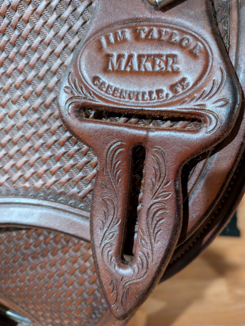 GORGEOUS saddle Custom made by Jim Taylor for Kendas Texas Western saddles. The seat measures 17" to stitching, finished to a comfy 16.5" Full Quarter bars. This has been a one owner saddle; western dressage inspired, but will be equally stunning in the ranch ring, working Equitation, or heading down the trail. The craftsmanship is beautiful! Features a nicely balanced seat pocket for great rider position and comfort. Classic styling with basket stamp tooling, dropped in- skirt rigging, and upgraded Jeremiah watt engraved dee rings.