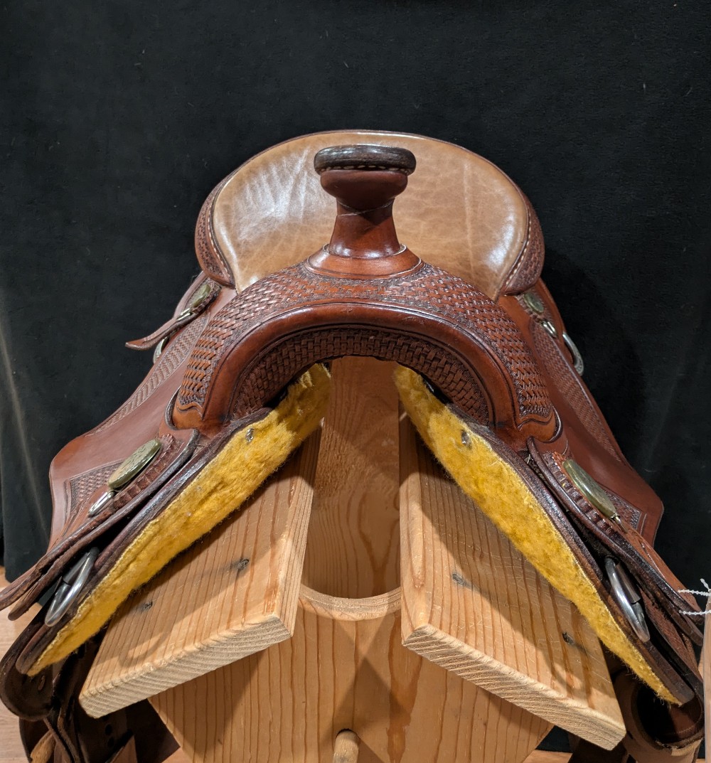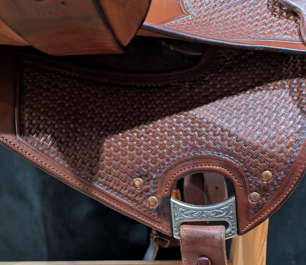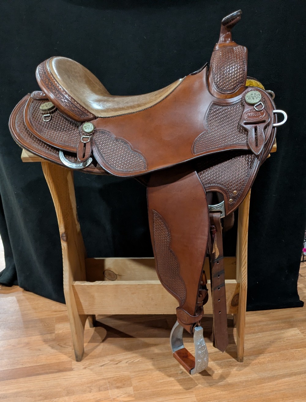 GORGEOUS saddle Custom made by Jim Taylor for Kendas Texas Western saddles. The seat measures 17" to stitching, finished to a comfy 16.5" Full Quarter bars. This has been a one owner saddle; western dressage inspired, but will be equally stunning in the ranch ring, working Equitation, or heading down the trail. The craftsmanship is beautiful! Features a nicely balanced seat pocket for great rider position and comfort. Classic styling with basket stamp tooling, dropped in- skirt rigging, and upgraded Jeremiah watt engraved dee rings.