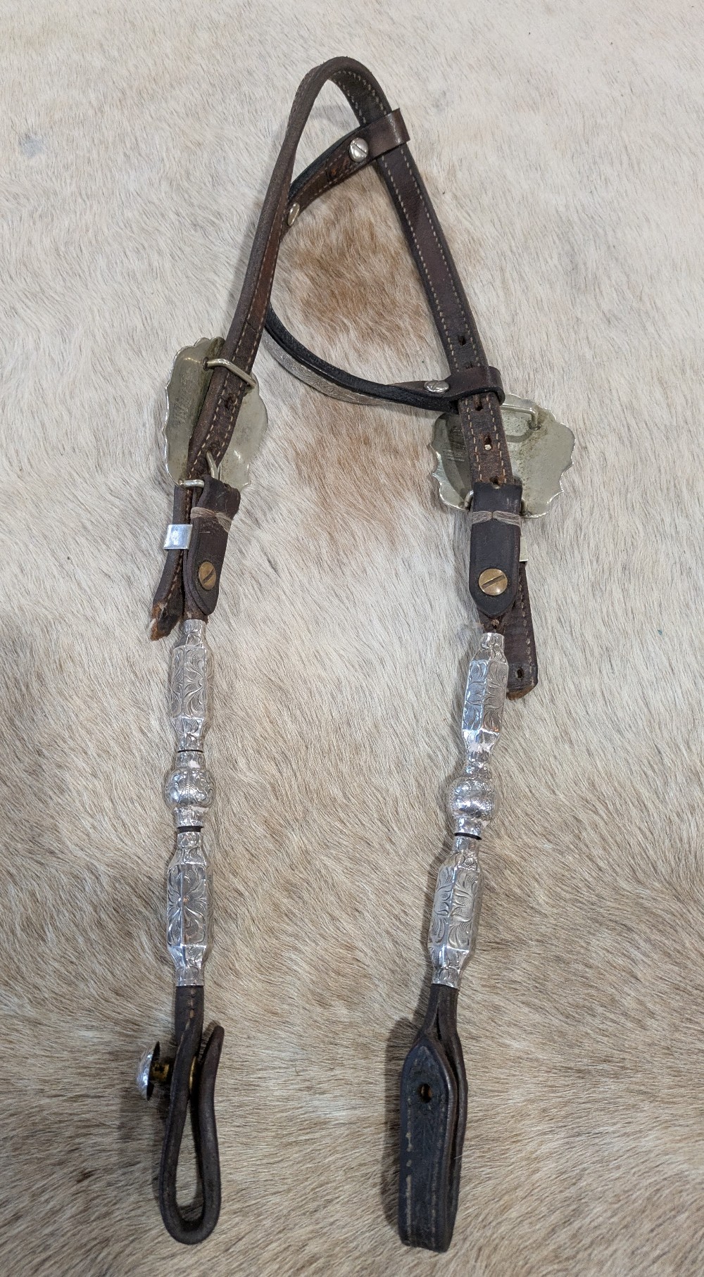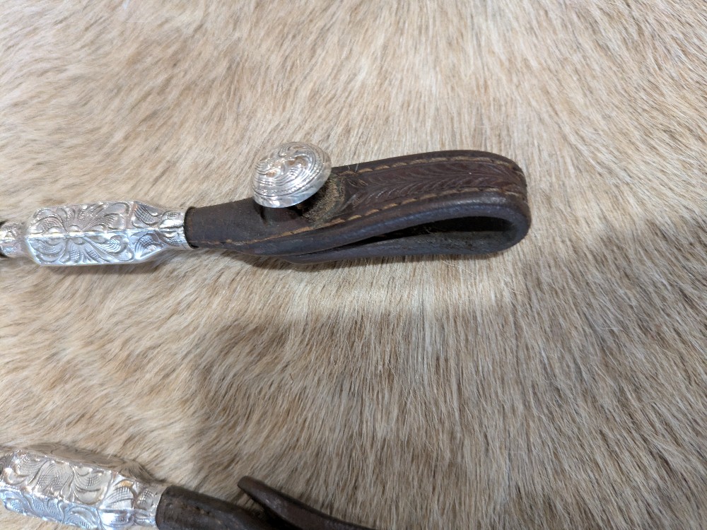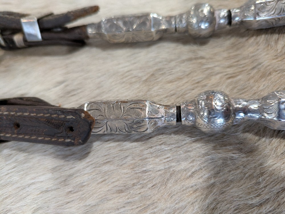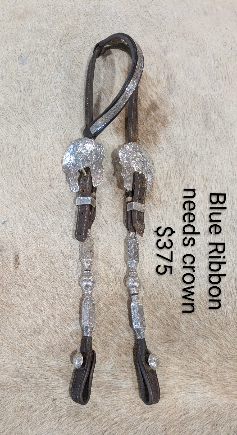 Beautiful Blue Ribbon headstall. Silver bar one ear with ferruled cheek pieces and scalloped buckles. Note: crown is cracked and missing silver tips will need to be replaced; prices accordingly. Shipping is $25 in the Continental USA, shipping available worldwide by quote.