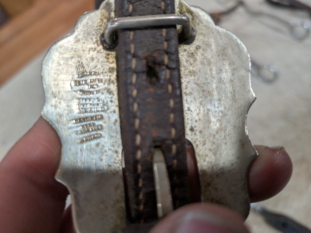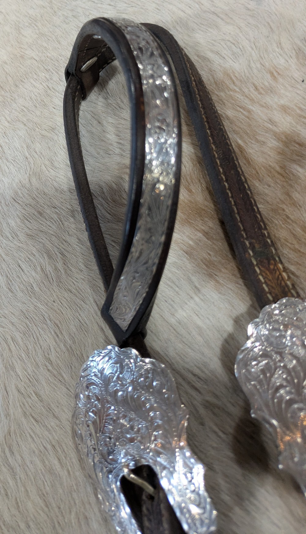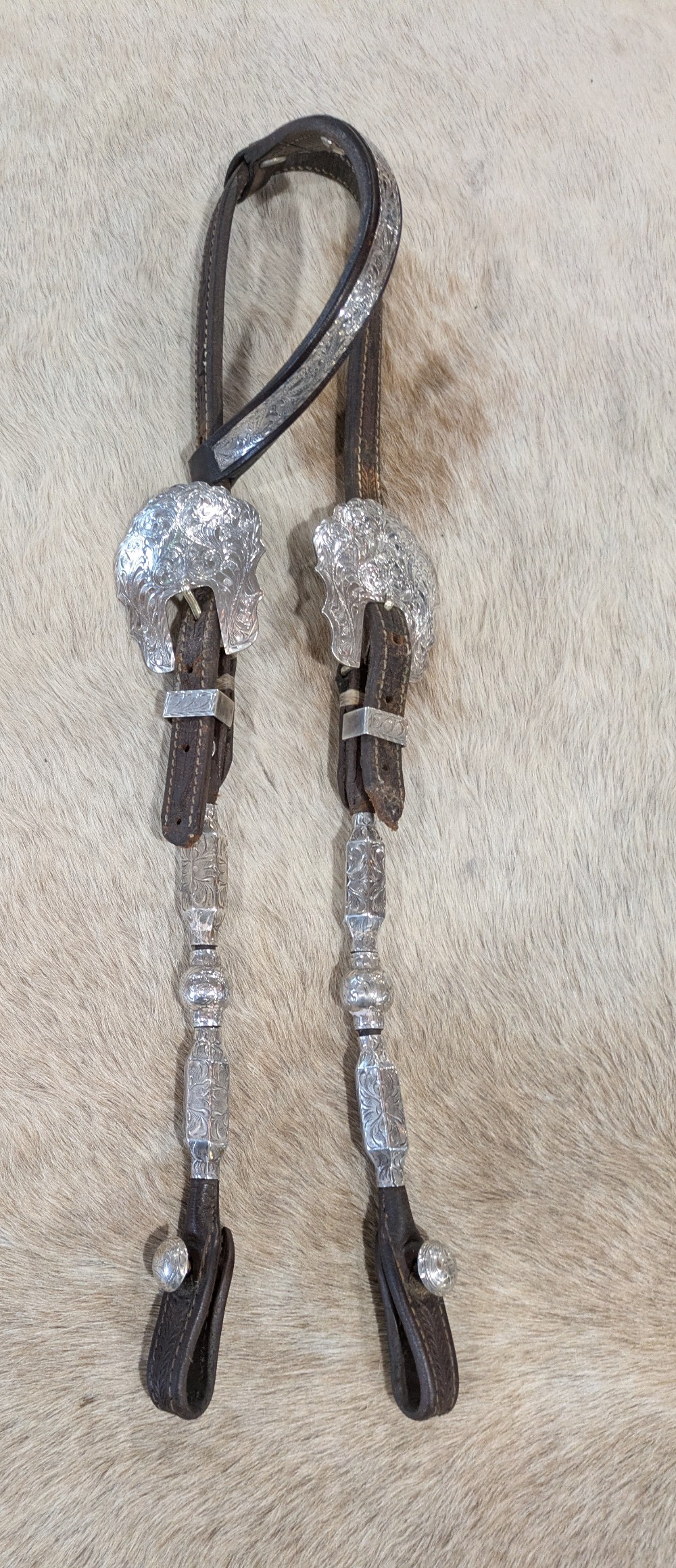 Beautiful Blue Ribbon headstall. Silver bar one ear with ferruled cheek pieces and scalloped buckles. Note: crown is cracked and missing silver tips will need to be replaced; prices accordingly. Shipping is $25 in the Continental USA, shipping available worldwide by quote.